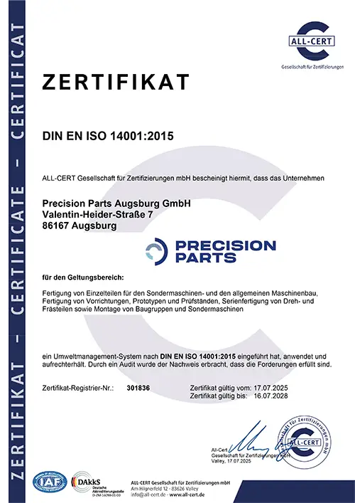 Precision Parts Augsburg ist nach DIN EN ISO 9001:2015 und DIN EN ISO 14001 zertifiziert. Damit garantieren wir nicht nur ein strukturiertes Qualitätsmanagement, sondern auch ein nachhaltiges, ressourcenschonendes Umweltmanagement – für gleichbleibend hohe Standards in allen Bereichen unserer Fertigung.
